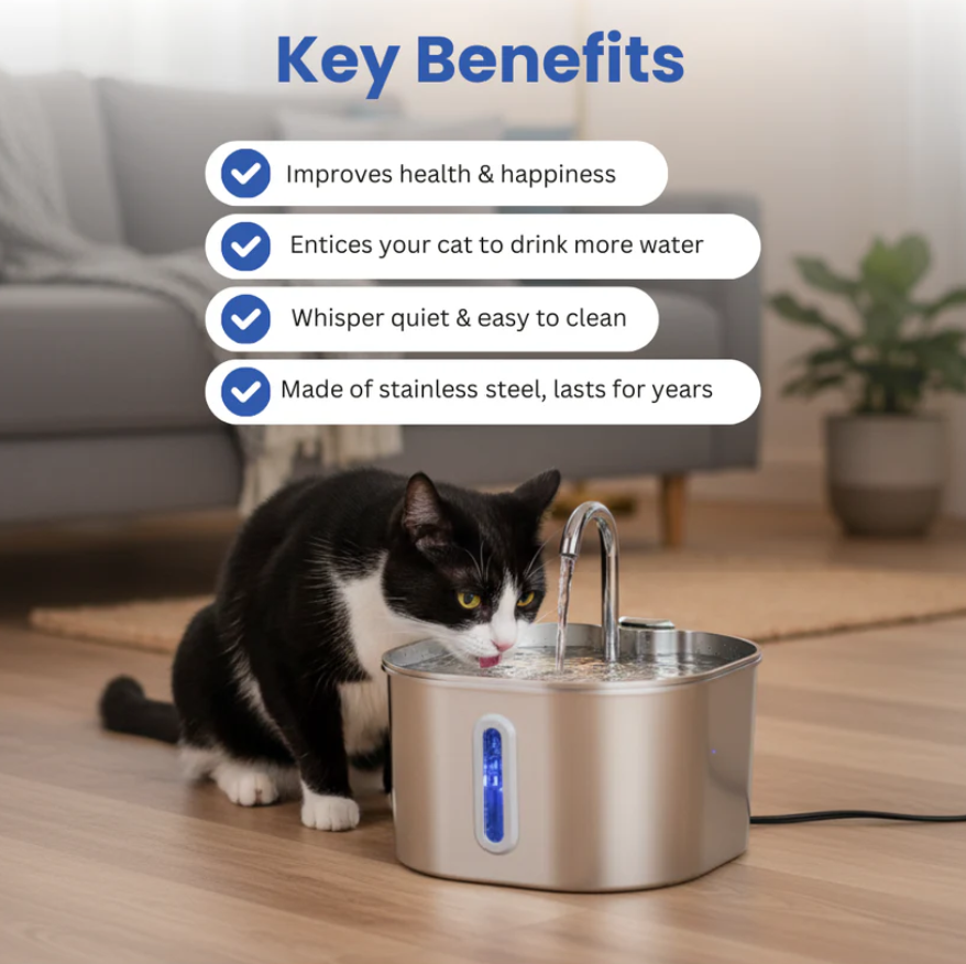 - Attractive Streaming Design: Mimicking the natural preference of pets for drinking flowing water, our stainless steel cat water fountain entices your furriends to drink more, keeping them well-hydrated and reducing the risk of kidney disease. Additionally, the flowing water increases oxygen levels, resulting in fresher, better-tasting water that your pet will love